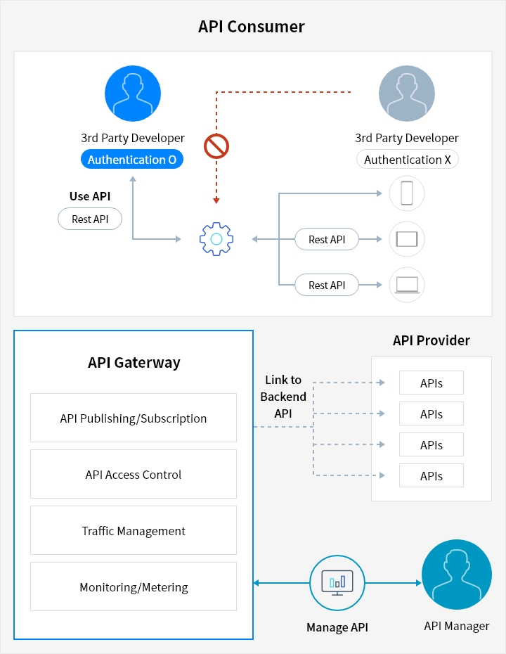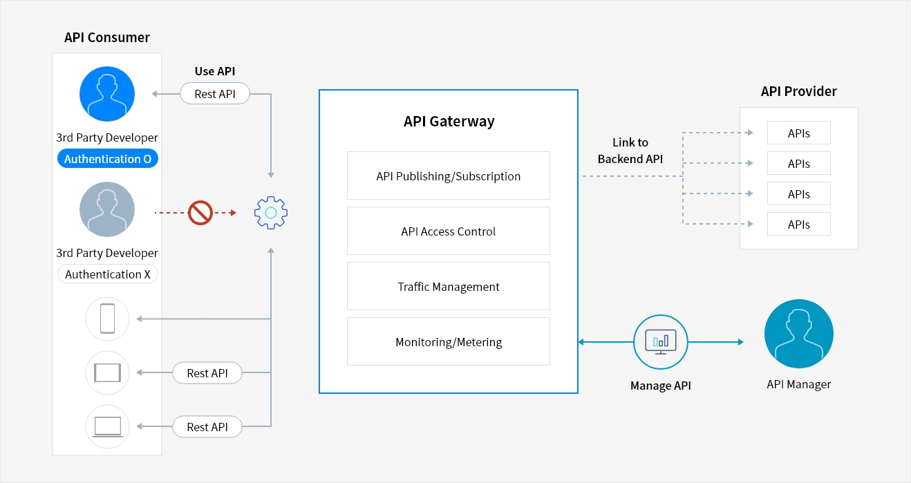 Users can register and manage API with ease using a console, and managing access control is possible with Json Web Token(JWT). Users can also call Cloud Functions with API Gateway.