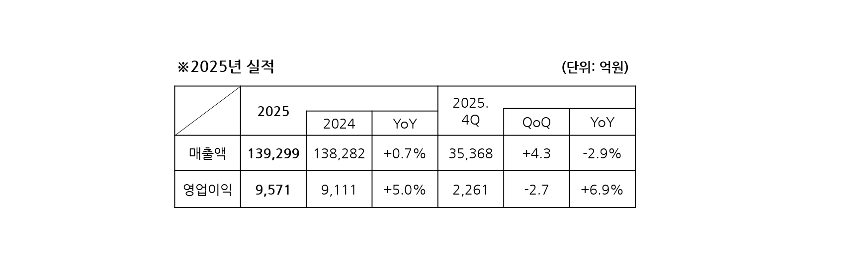 2025년 4분기 매출액은 전년 동기 대비 2.9% 감소한 3조 5,368억 원, 영업이익은 6.9% 증가한 2,261억 원으로 집계됐다.
