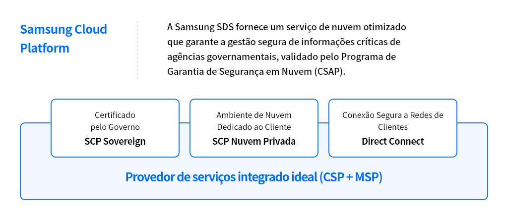 "O governo está tornando a transformação para a nuvem sua principal diretriz política para concretizar as plataformas digitais governamentais baseadas em inteligência artificial e dados, mas era difícil desenvolver a área de utilização da tecnologia em nuvem como uma iniciativa pública. A fim de expandir as oportunidades para revitalizar a economia local e garantir um sistema de fornecimento de serviços digitais liderado por empresas privadas, os governos locais estabeleceram um sistema de serviço em nuvem para o Governo, baseado na Samsung Cloud Platform, com a Samsung SDS."
