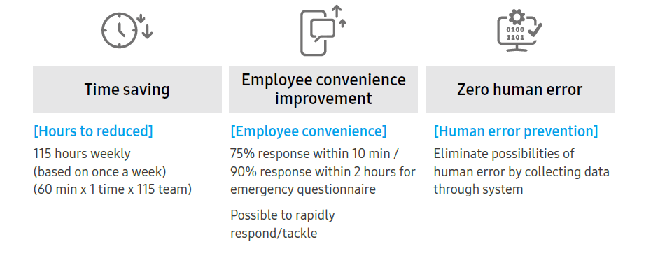 In earlier stages, Samsung SDS has contacted employees by team and at the department level for COVID-19 Questionnaire. However, it was not easy to individually contact 12,000 Employees, which takes a lot of time and effort in the course of collecting questionnaire results manually.