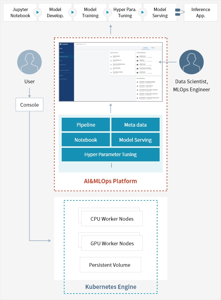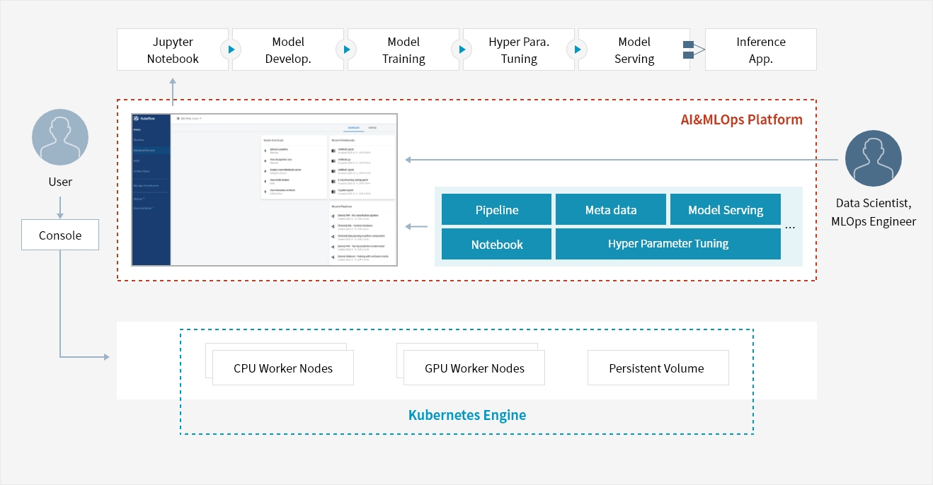 AI&MLOps Platform offers ML model development environments optimized for cloud, enabling Kubernetes-based linking with various open source software.