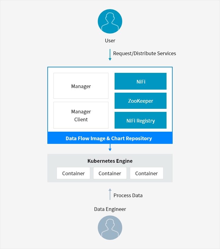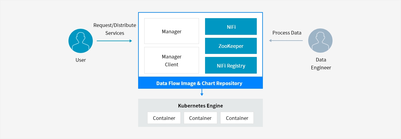 The installation of Data Flow in a standard Kubernetes cluster environment is easy using a web-based console. By auto-configuring the architecture needed for open source Apache NiFi-based scalable clustering, ZooKeeper, registry and management modules are installed automatically. Using Data Flow, configuration files and NiFi template needed for service connection can be configured as well as deployed.