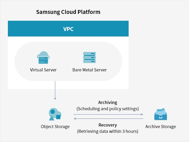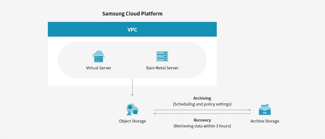 Samsung Cloud Platform Console offers features to create buckets, set up archiving schedules, and perform a data retrieving. Users can specify the archiving target by Object Storage bucket as a whole and they can also transfer data and apply a data source deletion policy.