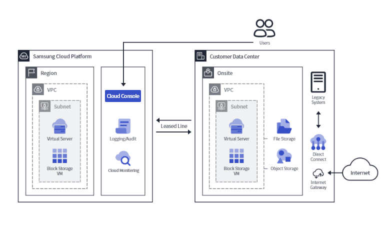 - Process on-site data real time, respond to requests such as storing key internal information - Install a dedicated line between Samsung SDS Datacenter and client Datacenter - Can be used as a hybrid model with resources within Samsung SDS Datacenter |