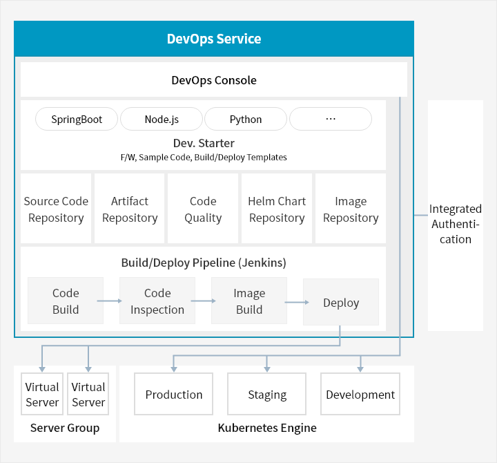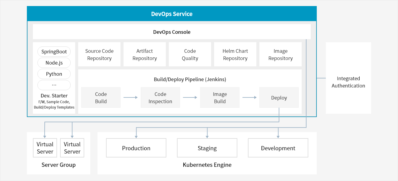 From building accounts for development to server deployment and release workflow management, integrated management is enabled. Direct integration with the Kubernetes cluster is possible through the DevOps Console, which allows for easy deployment.