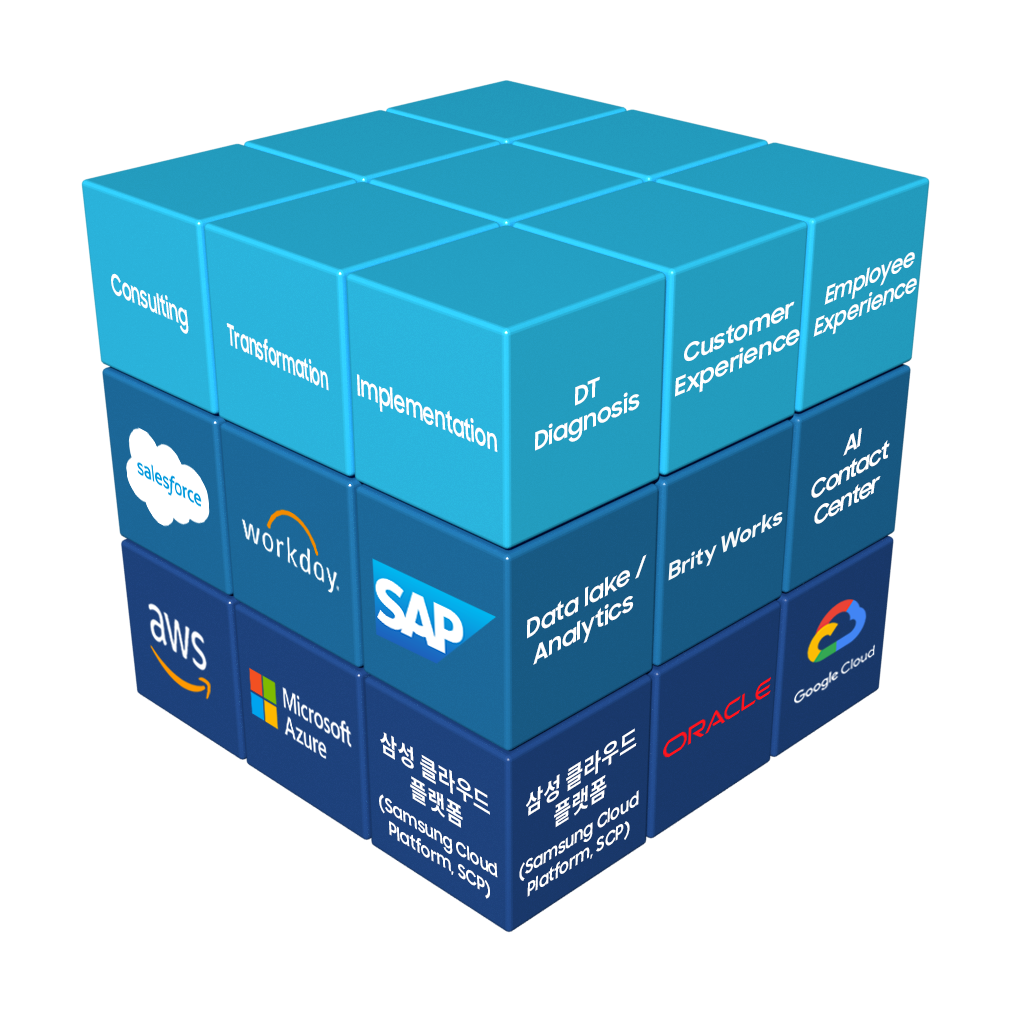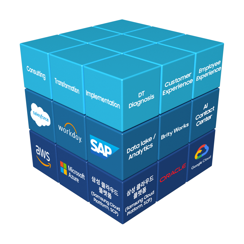 upside - consulting, Transformation, Implementation, DT Diagnosis, Customer Experience, Employee Experience middle - salesforce, workday, SAP, Data lake/ Analytics, Brity Works, AI Contact center under - AWS, Microsoft Azure, Samsung Cloud Platform, Oracle, Google cloud