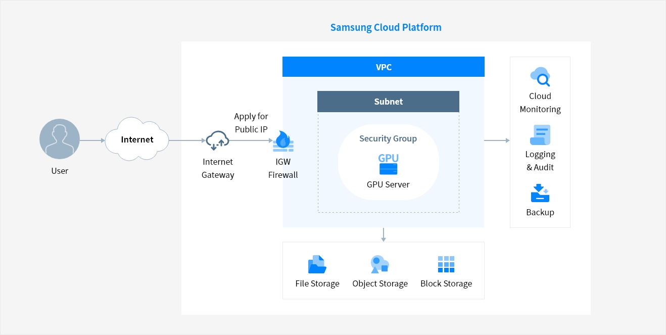 Virtual Servers are securely protected by inbound/outbound traffic control with external Internet or other VPC (Virtual Private Cloud) through Security Group service. Real-time monitoring also support reliable operation of computing resources.