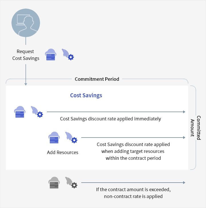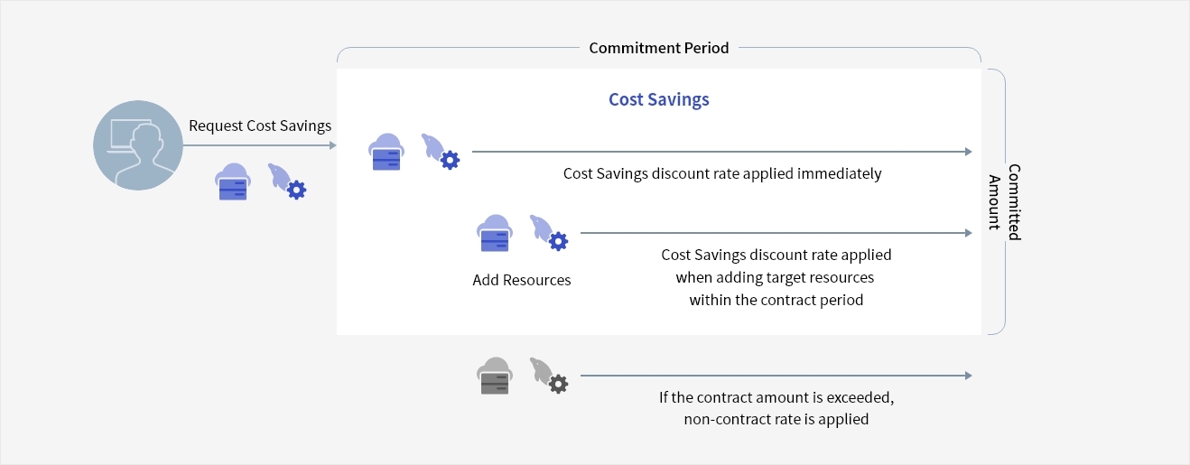 Even if the user increases or decreases the resource specifications or changes the OS, Cost Savings will be automatically applied to the changed resources, and the Cost Savings fee for each target service will not change based on the hourly contract amount. When increasing non-contracted resources, it can be applied for additional Cost Savings to apply for a discount.