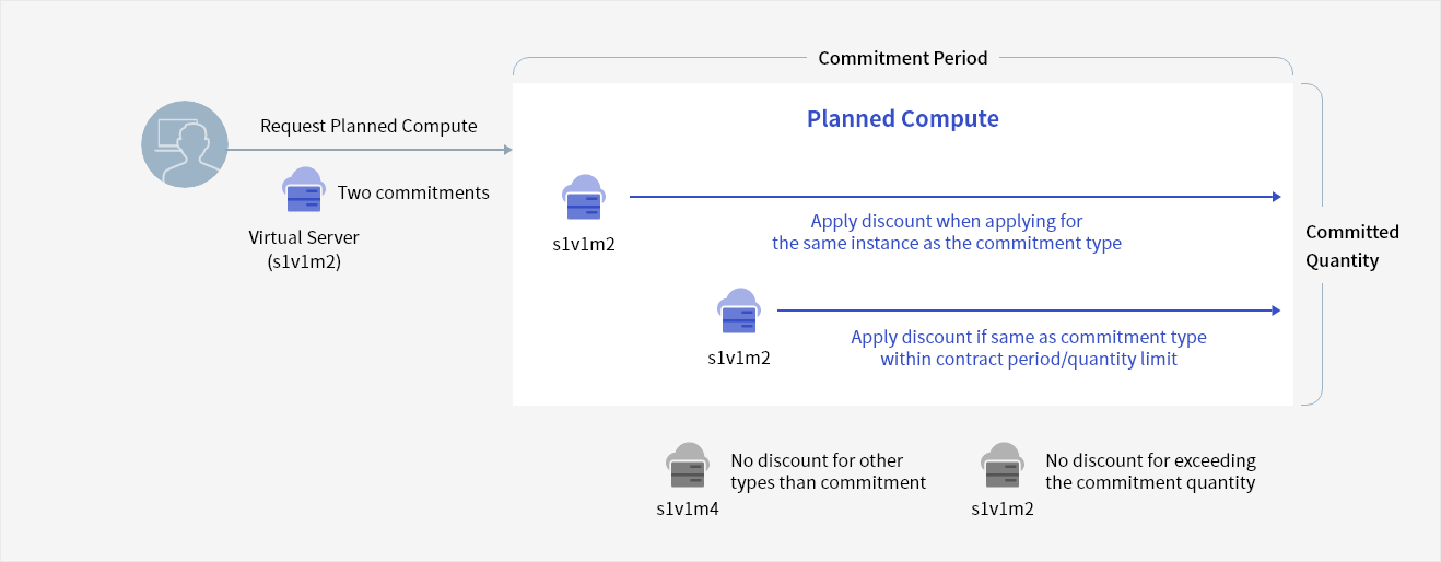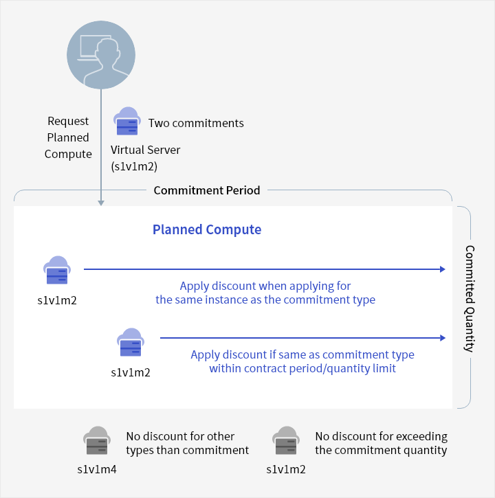Commitments that use specific types of instances in the Compute, Database, and Data Analytics service categories offer Planned Compute discounts. Discounts are offered in the order of application when applying for the same instance as the committed type(vCore/Memory/OS), and discounts are not offered if the commitment quantity is exceeded.
