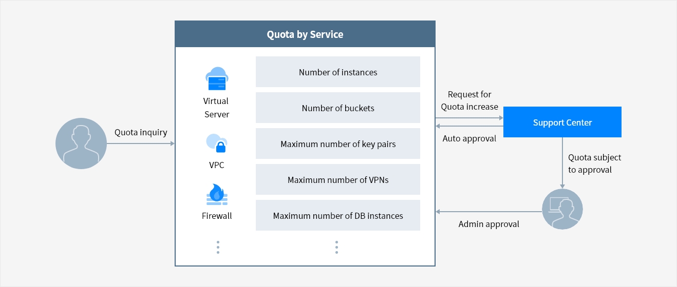 Quota Service allows you to conveniently manage over 100 service quota items, including the number of Virtual Server instances, VPC, and Firewall settings, from a single console.