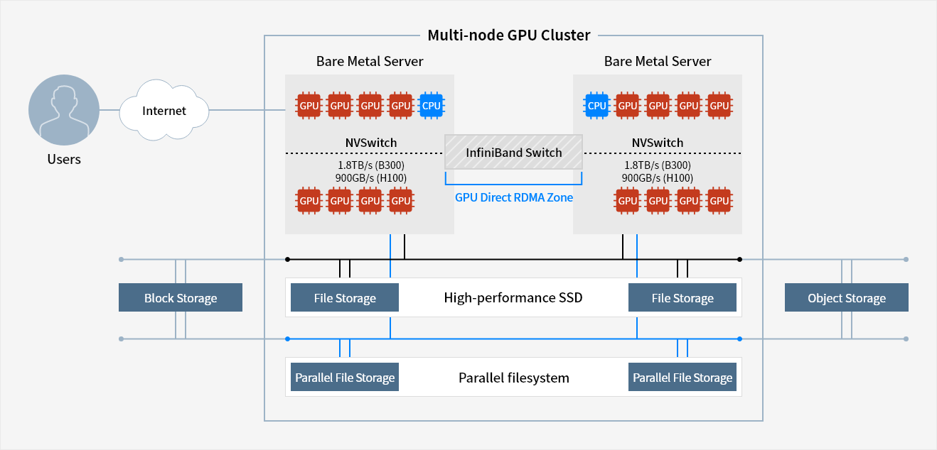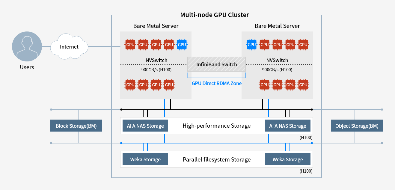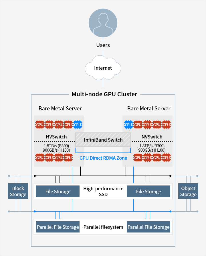 Multi-node GPU Cluster uses Bare Metal Server, which is embedded with highperformance NVIDIA SuperPOD architecture. Using the GPU, it handles multiple user jobs or high-performance distributed workload of large-scale AI model learning.