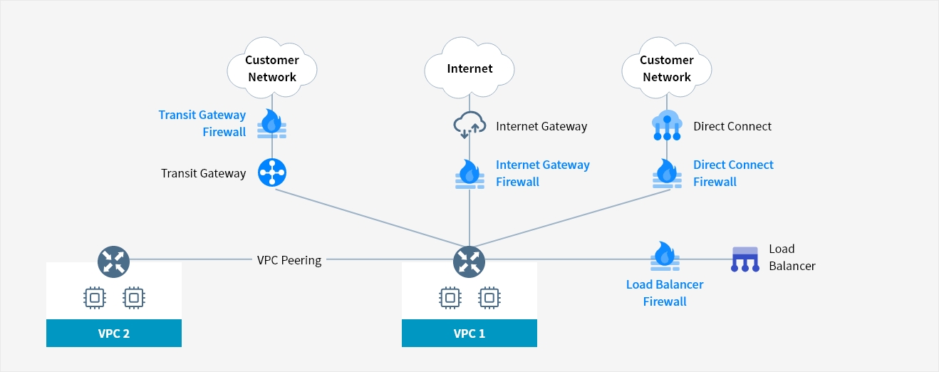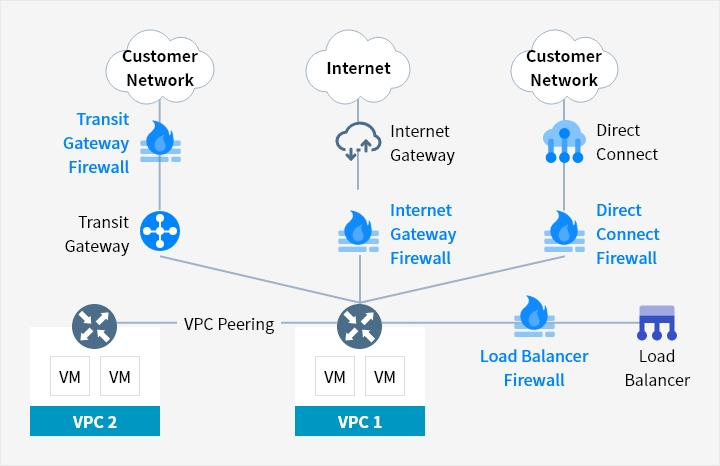 Samsung Cloud Platform offers logical firewalls to each of the VPCs, customer networks and various network environments for Internet connection, securely protecting the network from unauthorized access.
