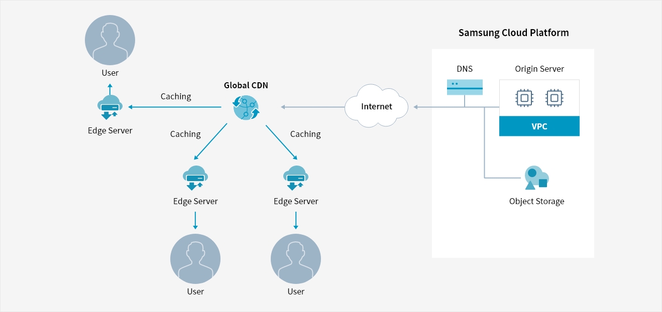 Signing up for the Global CDN service is quick and easy thanks to the web-based console on Samsung Cloud Platform. The origin server and caching policy of the Edge server are also easy to set up, allowing for fast content delivery.