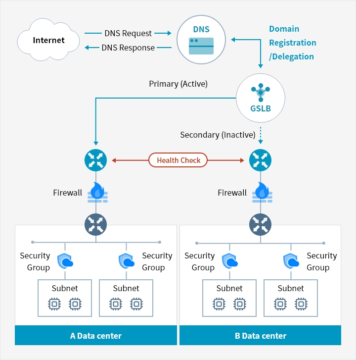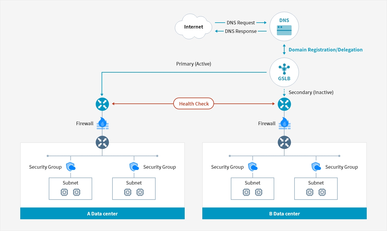 Health check is conducted to see if the connected resources are running normally. In case of failure on a server, the resource is immediately processed as failover and removed from domain responses to detour traffic to other resources and provide reliable service.