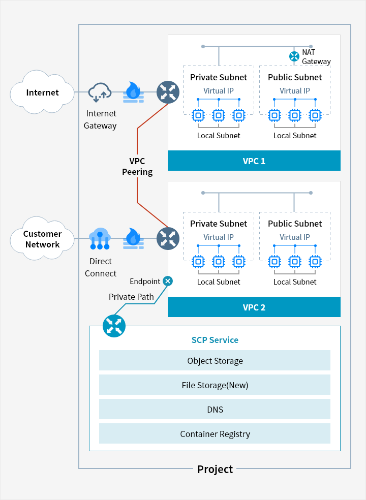 Networks of diverse requirements, including Internet connection and customer’s internal network connection, are logically configured to enable more cost-efficient operation compared to high-cost physical network infrastructure. VPCs without Internet connection may also access Object Storage for efficient storage of large-capacity data.