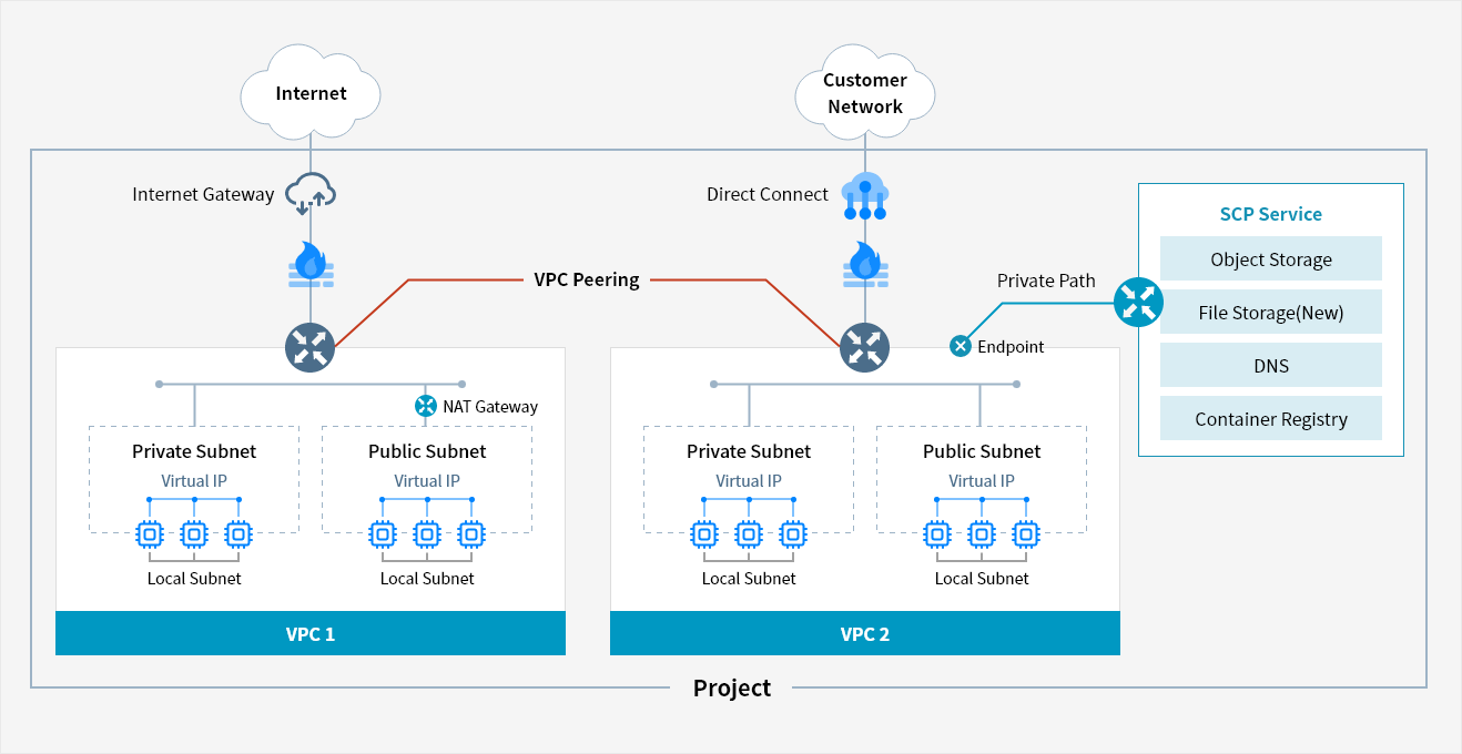 Private IP-based communications among VPCs are enabled with VPC peering. The network configuration is convenient with free choices among NAT and Internet gateways. Firewall and log management features are available by connection zone and users can easily control traffic using routing setting.