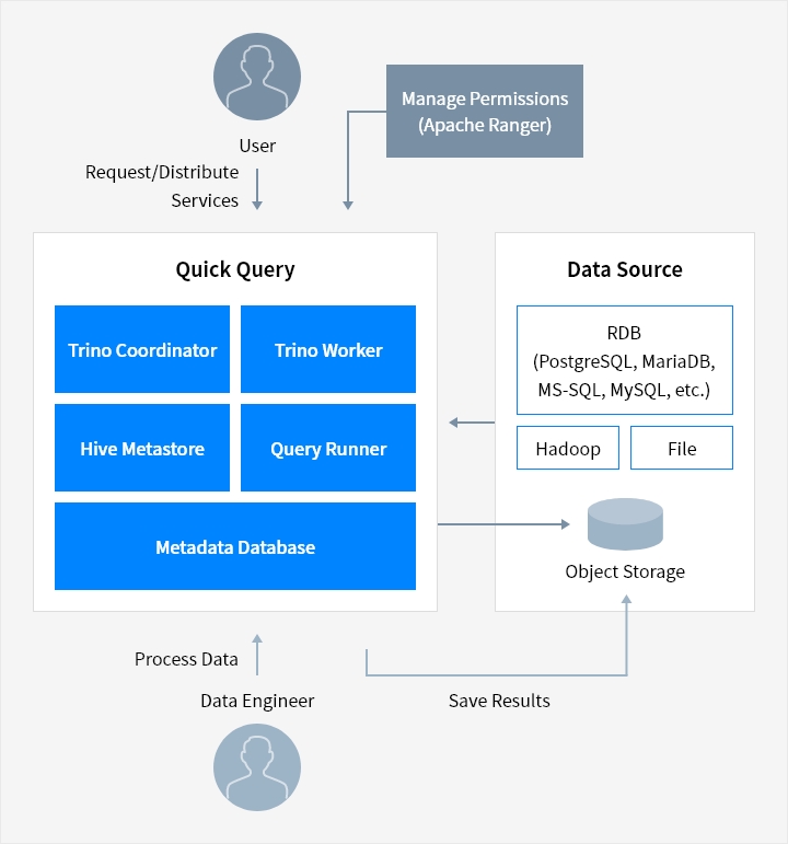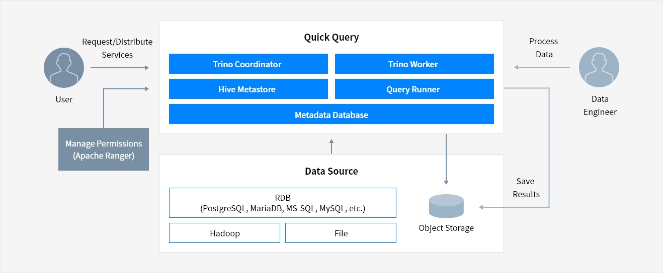 Quick Query uses a Trino engine capable of parallel processing to split query automatically, and query result for large data sets is delivered quickly by performing parallel processing on multiple nodes concurrently.