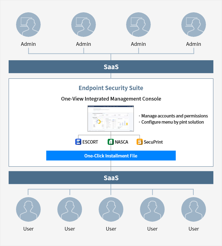 The management console, which used to be provided by solution types(ESCORT/NASCA/SecuPrint), is now offered as an integrated one-view console. This makes it easier to manage solutions and enhance the efficiency of security operations.