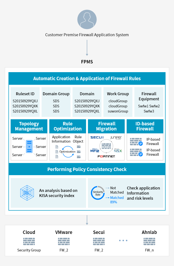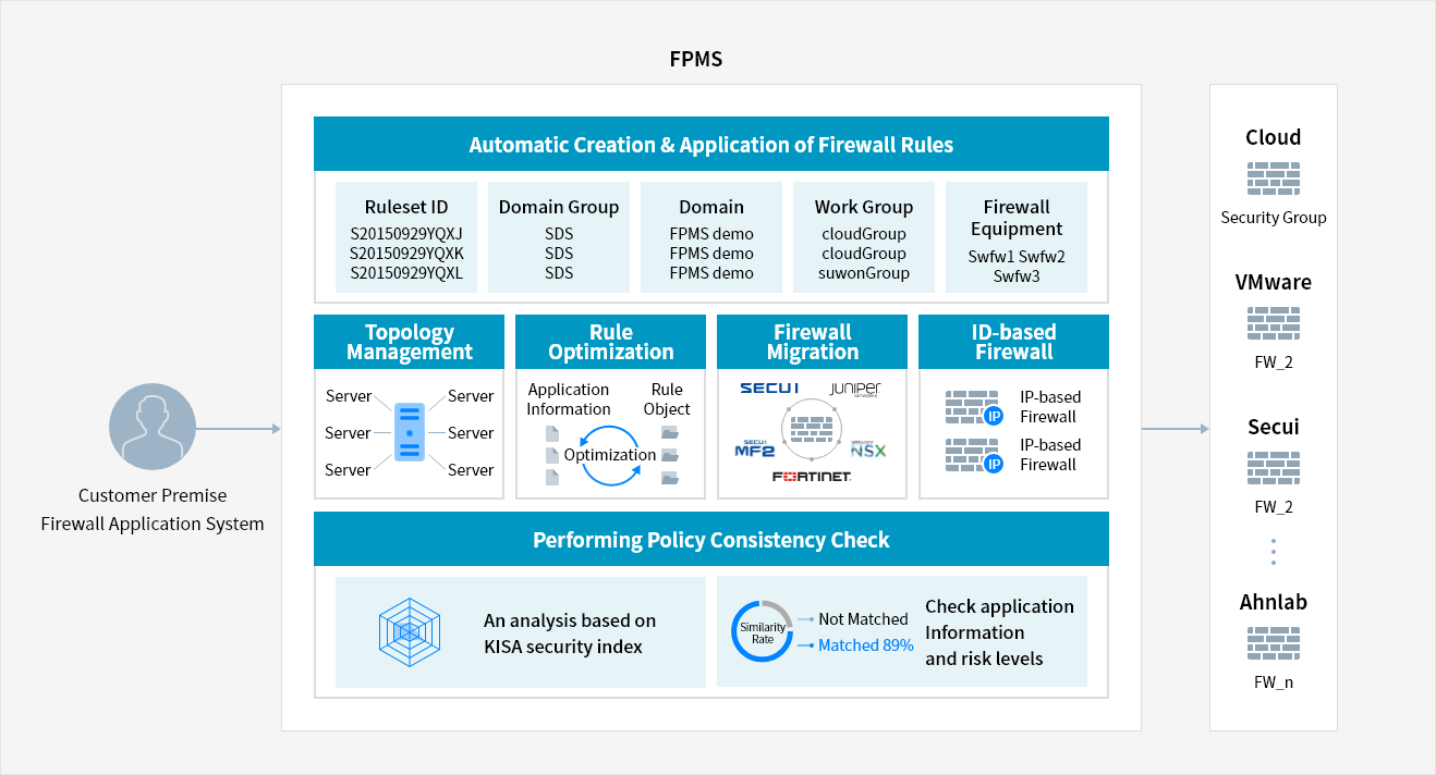 FPMS prevents human errors caused by manually registering firewalls. It also analyzes the grammar and structure of the application information such as IP and port information, and converts it into an acceptable data form, thereby preventing failures.