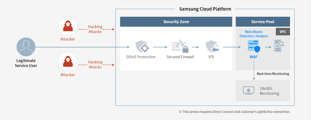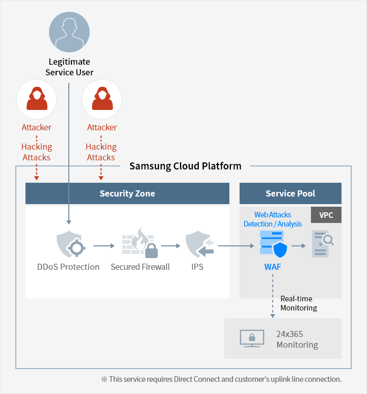 By monitoring HTTP, HTTPS port traffic of customer-defined IPs, WAF service monitors for hacker's attack attempts in real-time. WAF service categorizes attacks including SQL injection, cross-site scripting (XSS) and web scans. And it can effectively respond to new web attack tactics by providing various defense mechanisms necessary for web security.