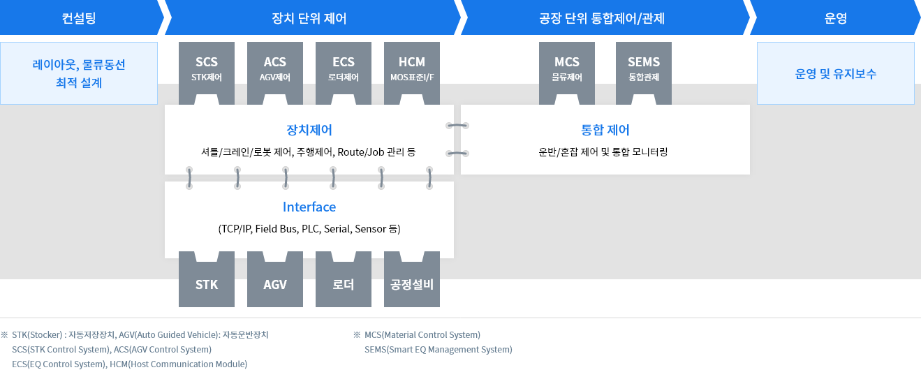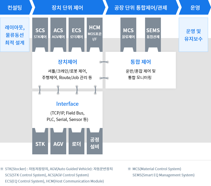 삼성SDS 제조 물류 자동화 서비스는 제어 솔루션 부터 AMHS 설비컨트롤러, H/W까지 Full Line-up을 구축하고 있지만, 필요에 따라 타사의 제어 컨트롤러 및 H/W와도 연동할 수 있도록 표준 Interface를 제공하여 이미 많은 호환 구축 Reference를 보유하고 있습니다.