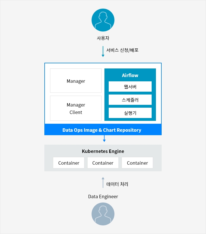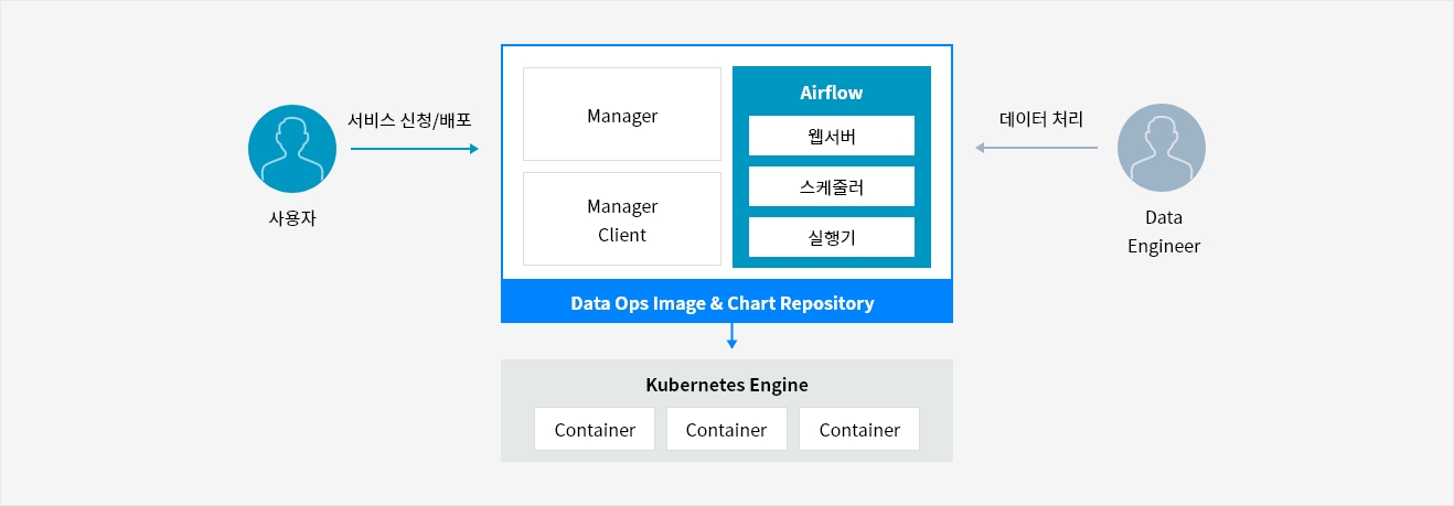 데이터 옵스는 표준 쿠버네티스 클러스터 환경에서 웹 기반 콘솔을 통해 손쉽게 설치가 가능합니다. Apache Airflow와 관리 모듈이 자동 설치되며, 통합 대시보드를 통해 웹 서버 및 스케줄러의 실행 상태에 대한 통합 모니터링이 가능합니다.