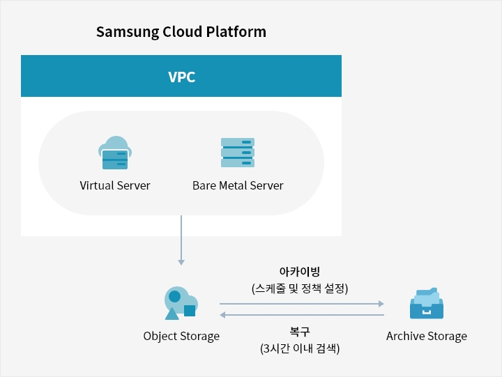 삼성 클라우드 플랫폼(Samsung Cloud Platform, SCP) 콘솔을 통해 버킷 생성, 아카이빙 스케줄 설정, 복구 등의 기능을 편리하게 사용할 수 있습니다. Object Storage의 전체 파일 대상으로 데이터 이관 후 원본 삭제 정책 적용이 가능합니다.