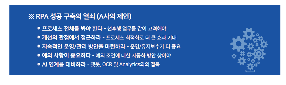 A사는 이에 대한 개선을 위해 단순히 업무 프로세스를 줄이는 것이 아니라 Digital 기술을 기반으로 근본적인 업무 혁신 및 업무 생산성 향상을 위하여 RPA 도입을 추진하였습니다.