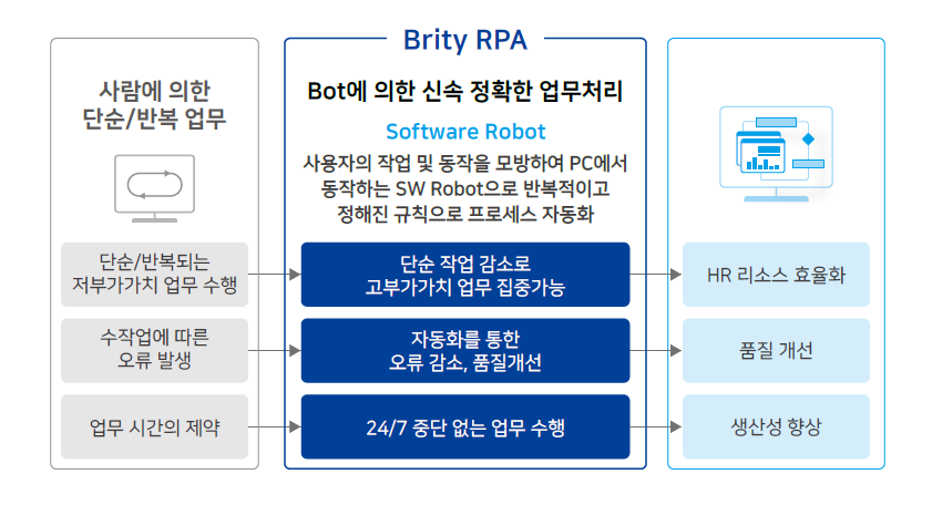 - 사람에 의한 단순/반복 업무, Brity RPA : Bot에 의한 신속 정확한 업무처리 Software Robot 사용자의 작업 및 동작을 모방하여 PC에서 동작하는 SW Robot으로 반복적이고 정해진 규칙으로 프로세스 자동화