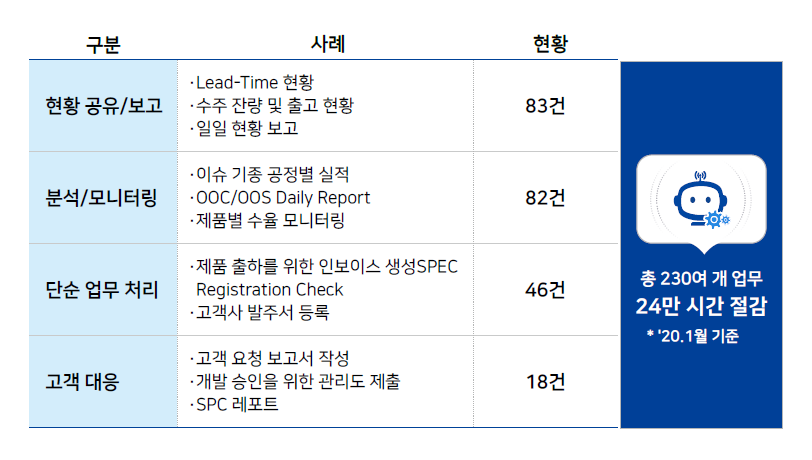 A사는 현재 제조, 개발, 영업, 품질 등 전 부문의 업무로 Brity RPA를 확대 적용하여, ’20년 1월 현재 약 230개 업무에 대해 24만 시간의 절감 효과를 가져오고 있습니다.