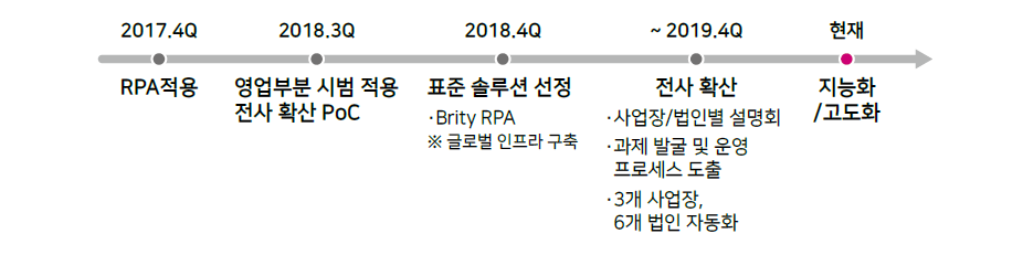 '17년 말 최초 RPA 도입 이후, '18년 시범 적용을 통해 RPA 효과를 검증하고, 표준 솔루션으로 Brity RPA를 선정하였습니다.