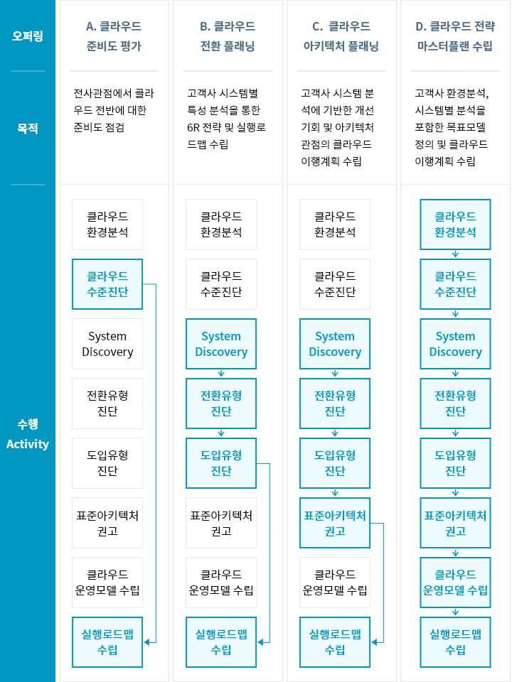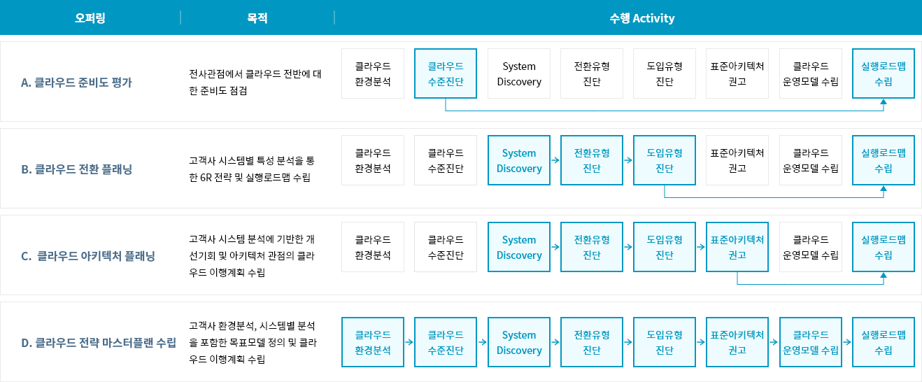 | D. 클라우드 전략 마스터플랜 수립 | 고객사 환경분석, 시스템별 분석을 포함한 목표 모델 정의 및 클라우드 이행 계획 수립 |