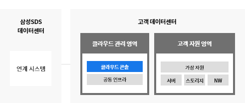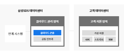 | 클라우드 관리 영역 구성 | 삼성SDS 데이터 센터에 구성된 관리 자원을 사용 | 고객사 전용 인프라에 관리 자원을 구성 |