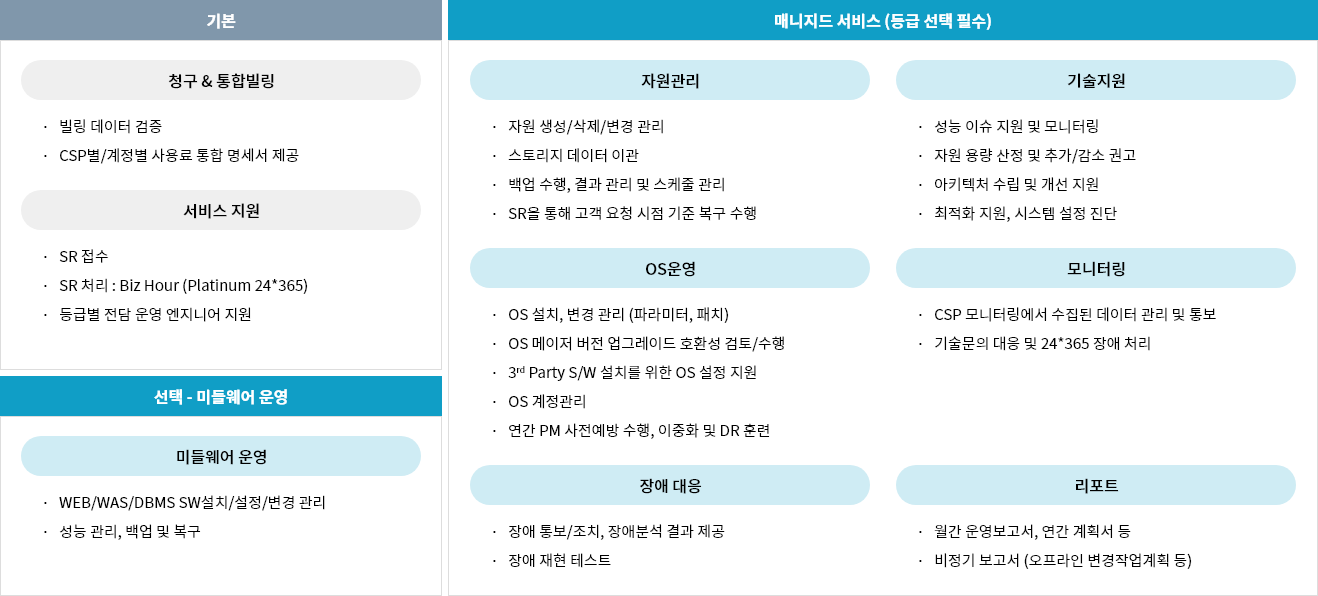 Cloud Native 환경으로의 업무 전환에 따른 일 하는 방식의 변화에 맞춰 통합된 운영 플랫폼을 이용하여 자원의 형상관리와 SR처리, SLA 측정 업무 등을 자동화하고 고객의 클라우드 자원을 효율적으로 운영합니다.