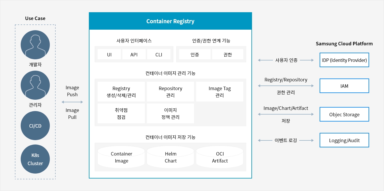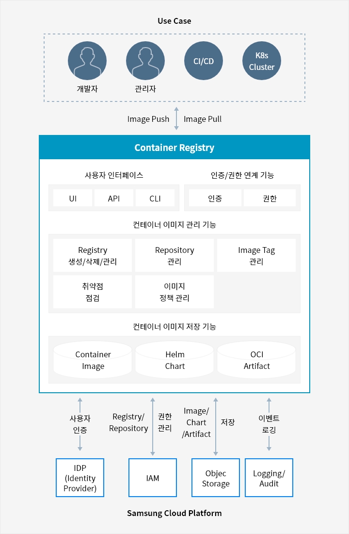 컨테이너 레지스트리를 이용하여 이미지를 안전하게 보관하고 사용할 수 있습니다. 컨테이너 레지스트리는 오브젝트 스토리지에 이미지를 암호화하여 저장하고 HTTPS를 통해 이미지를 전송합니다. 삼성 클라우드 플랫폼 (Samsung Cloud Platform, SCP)의 IAM 리소스 기반 정책을 사용하여 리포지토리 별 접근 권한을 설정하고, 설정한 권한에 따라 이미지를 사용할 수 있습니다.