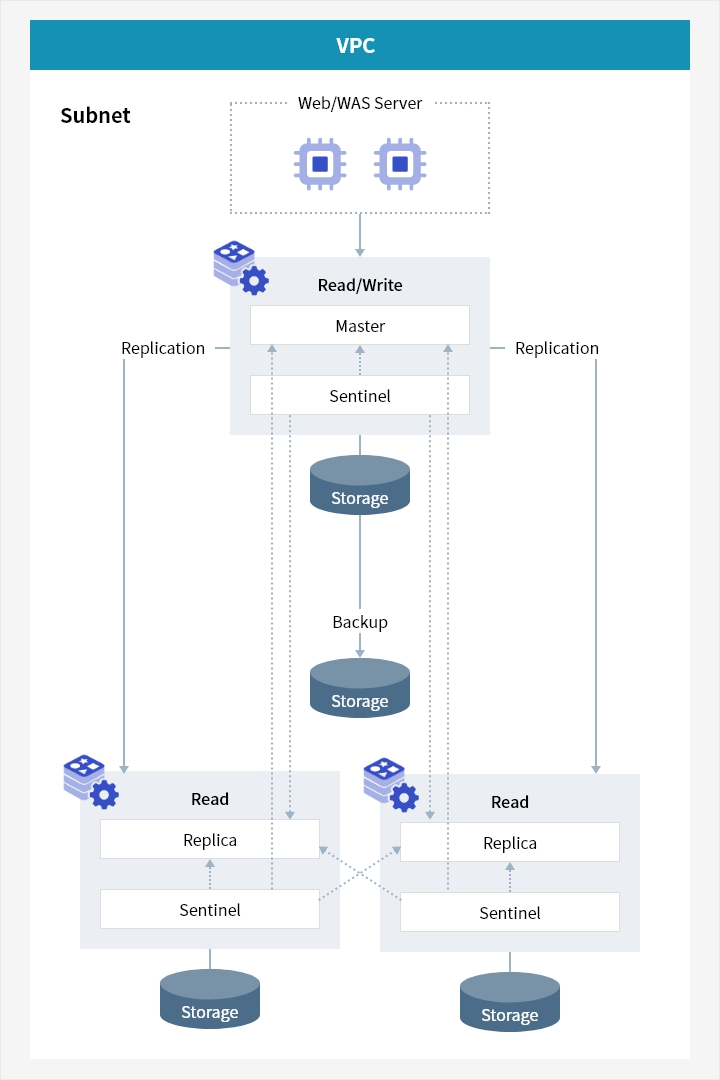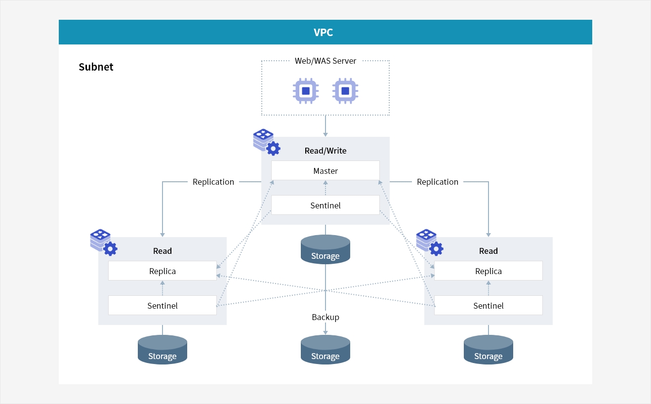 - HA 구성 : Sentinel 기반의 고가용성 구성 방식 제공(Single Master - Replica)