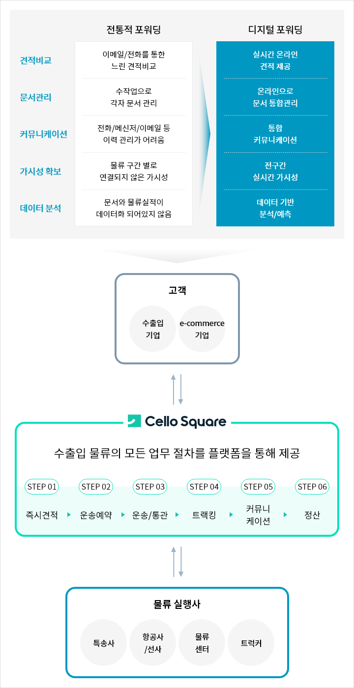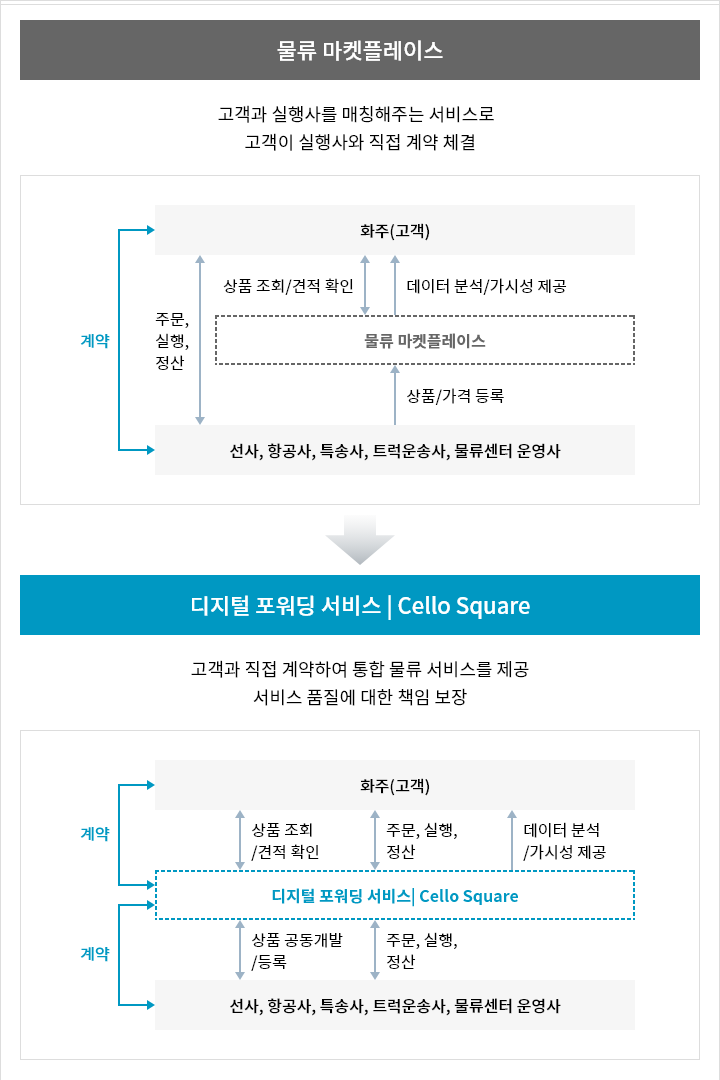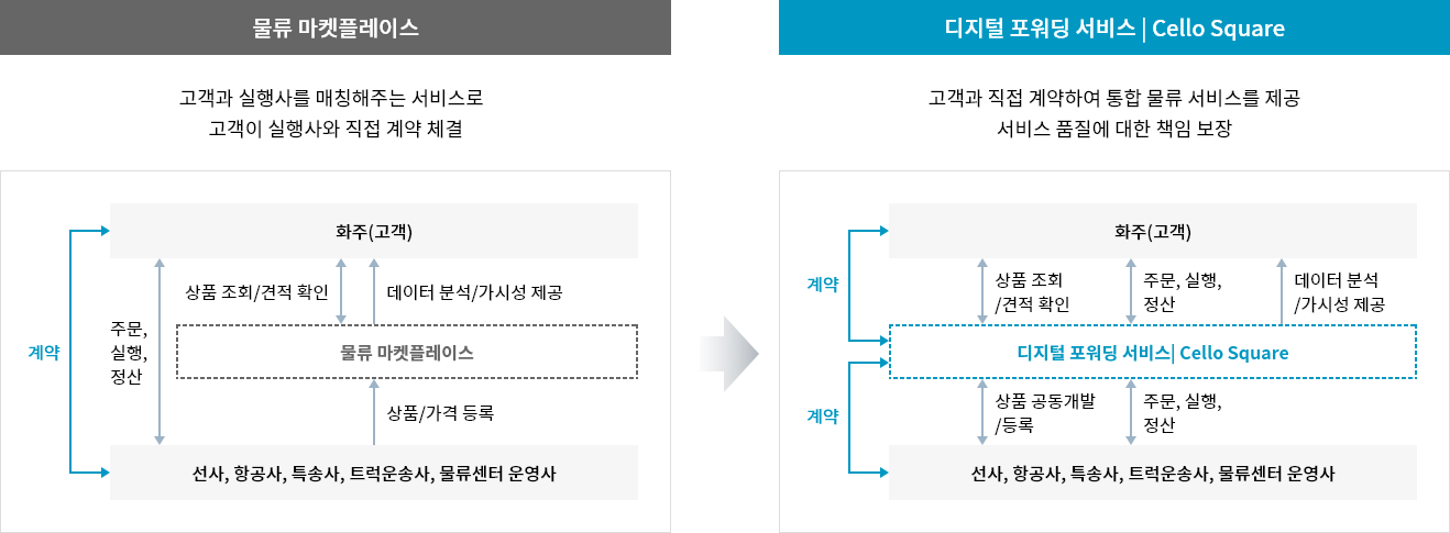 디지털 포워딩 서비스 Cello Square와 선사, 항공사, 특송사, 트럭운송사, 물류센터 운영사: 계약, 상품 공동개발/등록, 주문, 실행, 정산