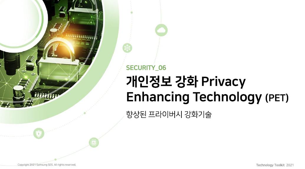 Technology Toolkit 2021 의 7가지 기술 중 Security 영역의 개인정보 강화 Privacy Enhancing Technology (PET) 자료 입니다.