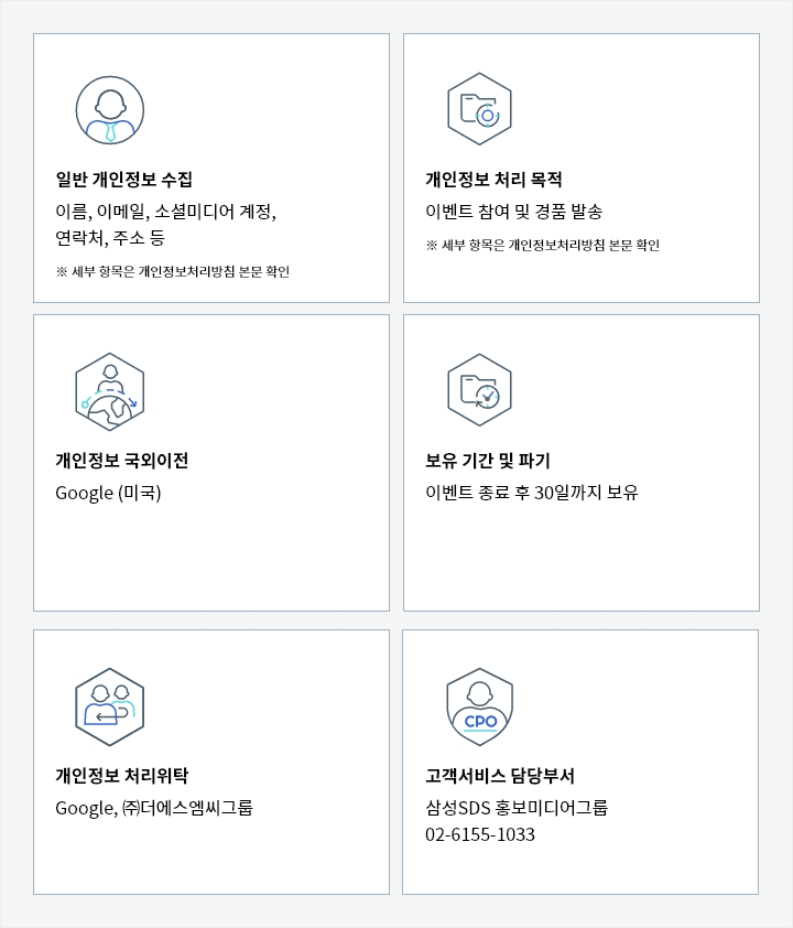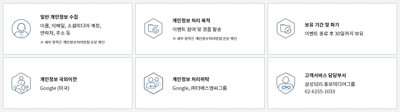 | 1600 Amphitheatre Parkway, Mountain View, CA 94043 | 이용자로부터 수집하는 개인정보 항목 일체 | 미국 | 이벤트 참여를 위한 본인 확인 및 경품 발송 | 수집 시 클라우드 서버 저장되며, 이벤트 종료 후 30일까지 보유 |