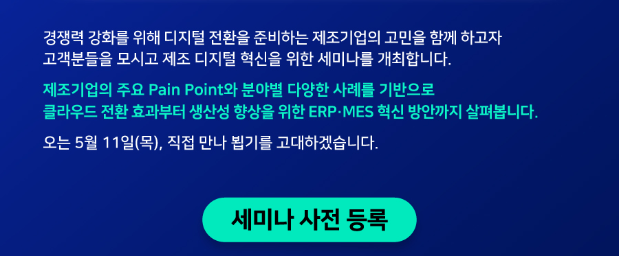 경쟁력 강화를 위해 디지털 전환을 준비하는 제조기업의 고민을 함께하고자 고객분들을 모시고 제조 디지털 혁신을 위한 세미나를 개최합니다.