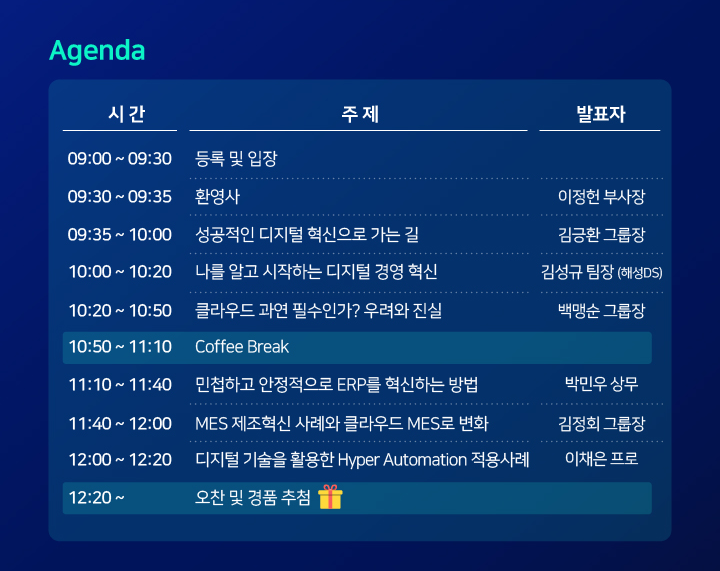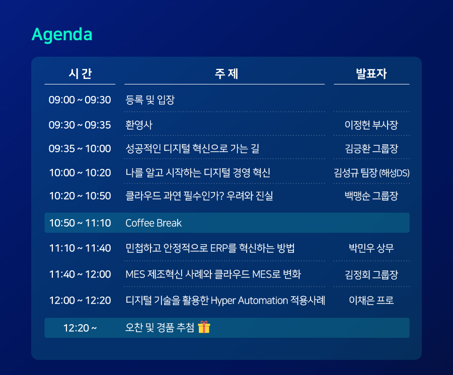| 10:00 ~ 10:20 | 나를 알고 시작하는 디지털 경영 혁신 | 김성규 팀장(해성DS) |
