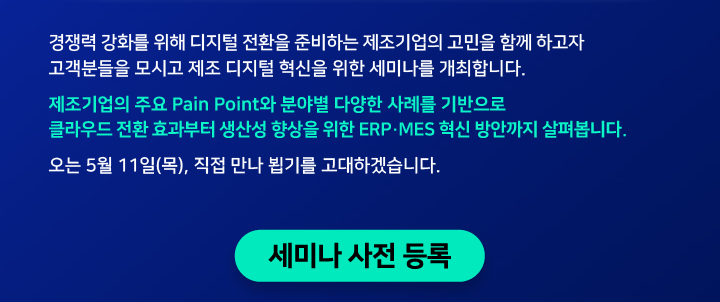 제조기업의 주요 Pain Point와 분야별 다양한 사례를 기반으로 클라우드 전환 효과부터 생산성 향상을 위한 ERP, MES 혁신 방안까지 살펴봅니다.