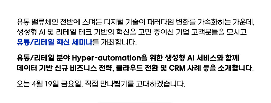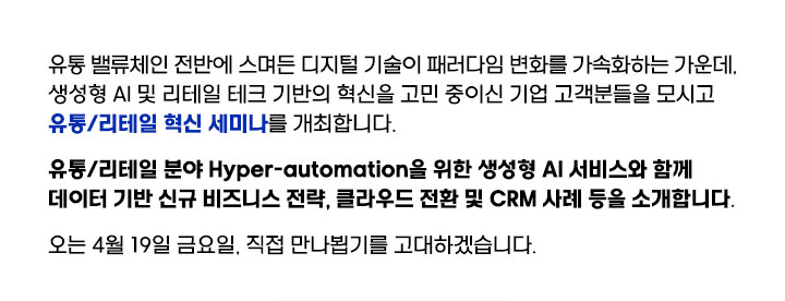 유통/리테일 분야 Hyperautomation을 위한 생성형 AI 서비스와 함께 데이터 기반 신규 비즈니스 전략, 클라우드 전환 및 CRM 사례 등을 소개합니다.