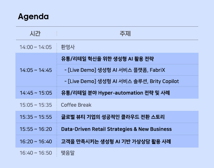 | 14:45 ~ 15:05 | 유통/리테일 분야 Hyperautomation 전략 및 사례 |