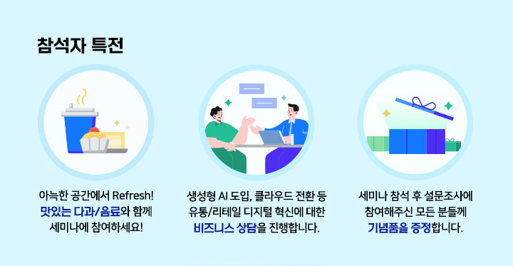 유통 밸류체인 전반에 스며든 디지털 기술이 패러다임 변화를 가속화하는 가운데, 생성형 AI 및 리테일 테크 기반의 혁신을 고민 중이신 기업 고객분들을 모시고 유통/리테일 혁신 세미나를 개최합니다.