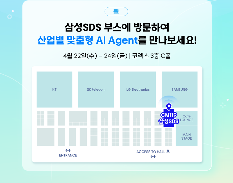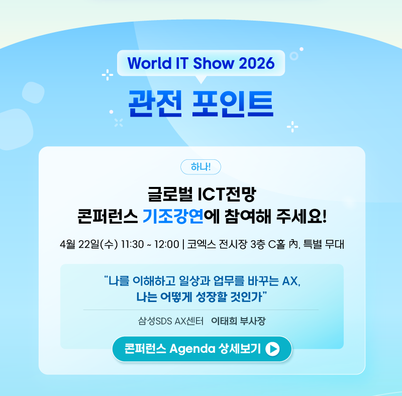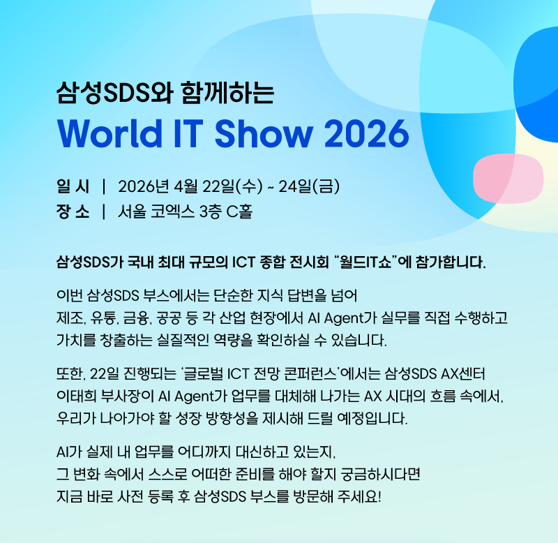 삼성SDS가 국내 최대 규모의 ICT 종합 전시회 "월드IT쇼"에 참가합니다. 이번 삼성SDS 부스에서는 단순한 지식 답변을 넘어 제조, 유통, 금융, 공공, 등 각 산업 현장에서 AI Agent가 실무를 직접 수행하고 가치를 창출하는 실질적인 역량을 확인하실 수 있습니다. 또한, 22일 진행되는 '글로벌 ICT 전망 콘퍼런스'에서는 삼성SDS AX센터 이태희 부사장이 AI Agent가 업무를 대체해 나가는 AX 시대의 흐름 속에서, 우리가 나아가야 할 성장 방향성을 제시해 드릴 예정입니다. AI가 실제 내 업무를 어디까지 대신하고 있는지, 그 변화 속에서 스스로 어떠한 준비를 해야 할지 궁금하시다면 지금 바로 사전 등록 후 삼성SDS 부스를 방문해 주세요!