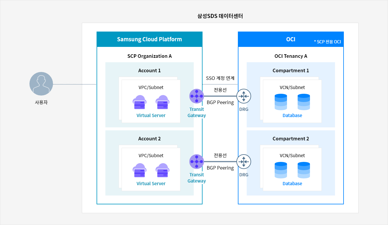 SCP Oracle Services는 Public OCI와 물리적/논리적으로 완전 격리되어 있어, 높은 수준의 보안성을 보장합니다. SCP가 제공하는 OCI는 빠르고 안정적인 전용선을 통해 SCP 리소스와 연결되며, 삼성SDS 데이터센터 내에서 안전한 OCI 사용 환경이 보장됩니다.