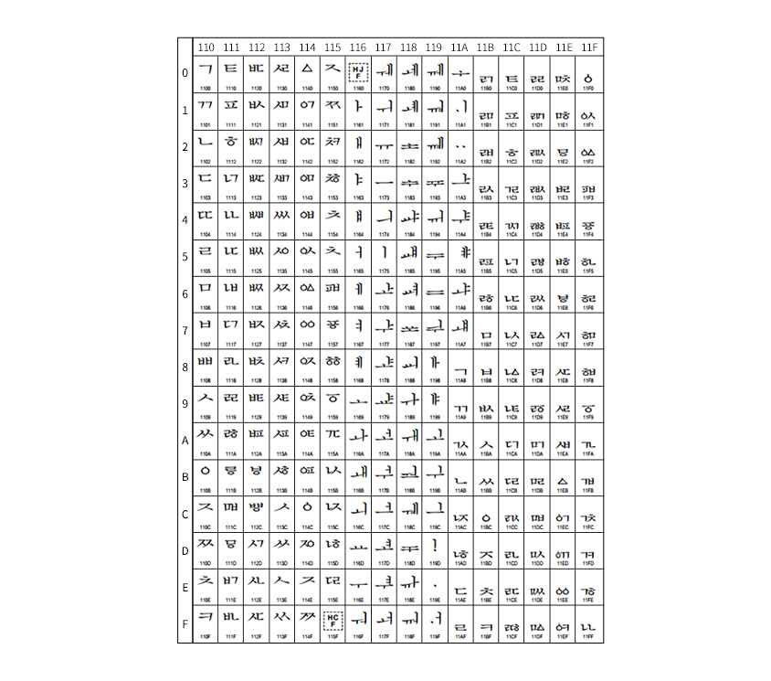 이미 눈치를 채셨겠지만, 알파벳 26글자에서 255글자까지 새로운 문자를 정의하게 된 아스키코드의 역사에서 보셨듯이 문자 체계가 복잡할수록 문자 집합, 즉 인코딩 방식은 복잡해지고 정착하는 데 오랜 시간이 걸리게 됩니다. 한글처럼 초중종성이 분리되어 무한대의 소리를 표현할 수 있는 언어는 그만큼 인코딩 방식을 설계하는 방법이 쉽지 않았으니까 말이죠.