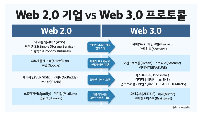 | 애플리케이션(음악/콘텐츠/재능) | 스포티파이(Spotify), 미디엄(Medium), 업워크(Upwork) | 오디우스(AUDIUS), 미러(Mirror), 브레인트러스트(Braintrust) |