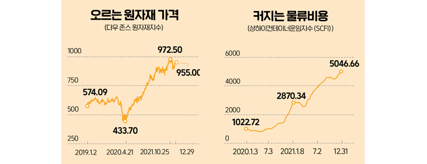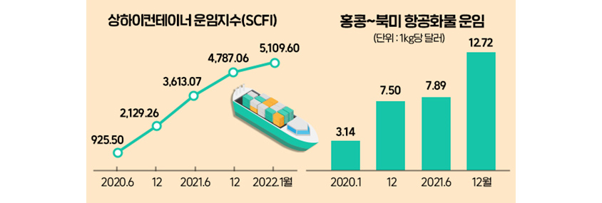 코로나 19 팬데믹으로 인한 글로벌 공급망 위기가 2022년 새해에도 지속되고 있다. 2021년 말 5000포인트를 기록한 상하이 컨테이너 운임지수(SCFI)가 지난 1월 7일 5109.6포인트까지 상승하여 역대 최고치를 경신했다. 이는 코로나 19 사태 초기인 2020년 초에 비해 5배 급등한 수치이다. 국내 수출 기업들이 주로 이용하는 미국 서부지역 해상 컨테이너 운임은 1FEU당 7,994달러, 미국 동부지역 운임은 1FEU당 1만 1833달러로 작년 12월 초에 비해 약 1,000달러 상승했다. 물류 업계에서는 전 세계 오미크론 변이 바이러스로 인한 코로나 19의 재확산과 미국 내 주요 수출입 항만의 병목현상이 단시간 내 해소될 수 없다는 이유로 조만간 1FEU당 부산-LA 항간 해상운임은 $10,000, 부산-뉴저지 항간 운임은 $15,000을 상회할 것이라고 우려하고 있다.